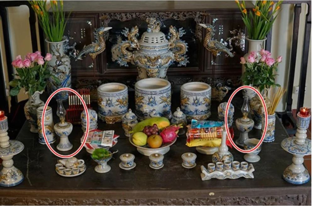 Với 5 ly trên kỷ nước thờ: Đại diện tổ tiên, bà cô ông mạnh được đặt hai bên, 3 ly ở giữa là sự thành tâm của gia chủ đối với các vị thần linh.