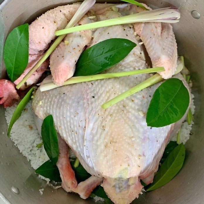 - Đặt gà vào nồi, úp phần bụng xuống, sau đó phủ thêm lớp muối lên thân gà.
