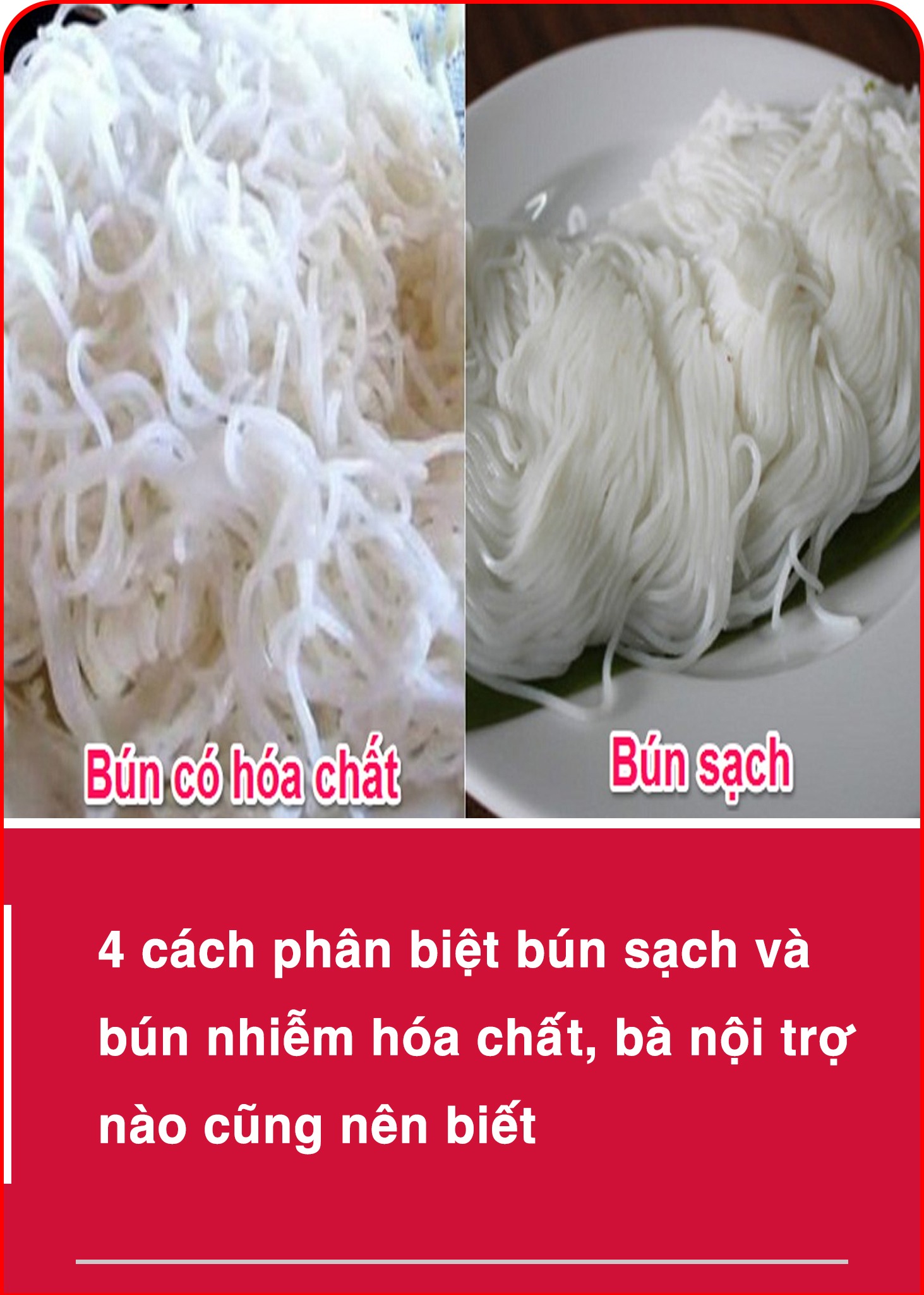 Với những mẹo nhỏ dưới đây sẽ giúp các bà nội trợ dễ dàng nhân biết được bún sạch tự nhiên và bún có chất tẩy rửa không bị người bán hàng qua mặt.