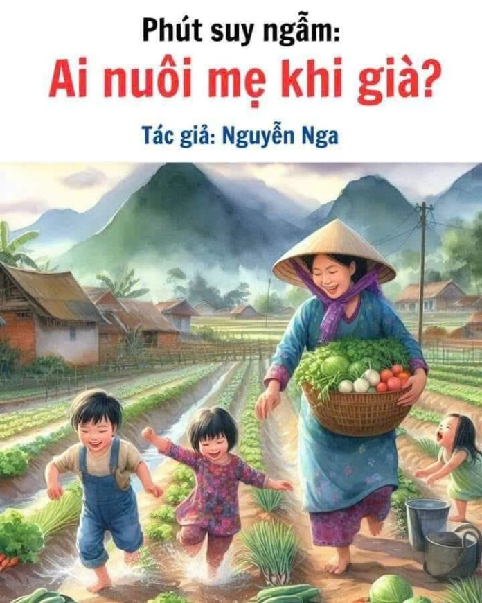 Cậu con im lặng, mặt nghệch ra vẻ suy nghĩ một chút rồi đáp trả: “Tuổi trẻ không gắng sức. Già cả con cháu nuôi! Mẹ đừng làm nữa, mai mốt con sẽ nuôi mẹ!”.