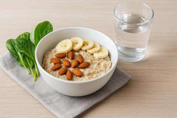 Một bữa sáng giàu magie: yến mạch, hạnh nhân, chuối và rau xanh – công thức đơn giản giúp tim mạch và não bộ luôn khỏe mạnh.