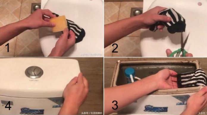 Cách làm: Đầu tiên, chuẩn bị một chiếc tất cũ và đặt một bánh xà bông vào đó. Tiếp theo sử dụng kéo cắt một lỗ nhỏ trên đầu ngón chân của tất. Sau đó đặt một nửa chiếc tất đã cho xà bông vào bồn vệ sinh phía trên.