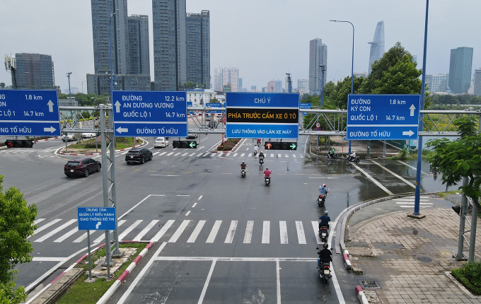 Giao lộ Mai Chí Thọ – Tố Hữu, trước lối vào hầm Thủ Thiêm vừa được thí điểm hệ thống đèn tín hiệu không đếm ngược thời gian, chiều 27/6. Ảnh: Đình Văn