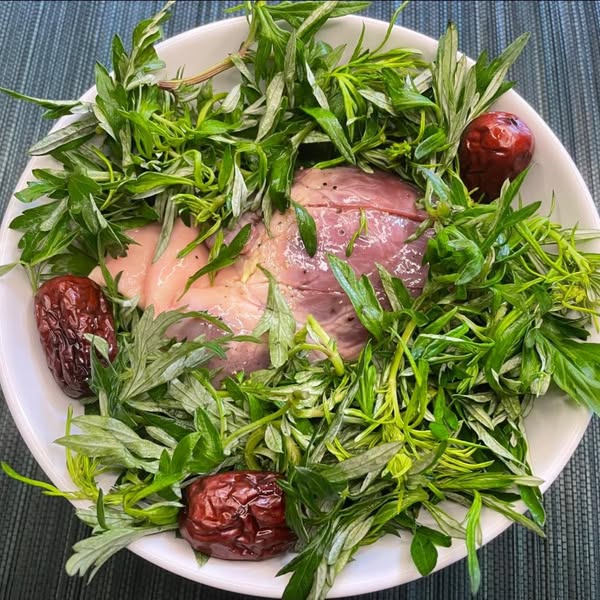 – Xếp một lớp ngải cứu vào dưới đáy bát, sau đó xếp tim heo lên trên. Thêm táo đỏ vào và rải thêm một lớp ngải cứu lên trên cùng.