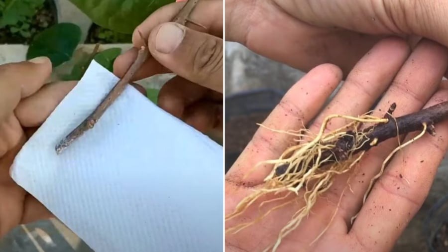 Thỉnh thoảng mở túi nilon và giấy ra ᵭể ⱪiểm tra ᵭộ phát triển của rễ và thay giấy, bổ sung nước. Khi thấy rễ ᵭã dài, bạn có thể chuyển phần cành giȃm vào trong chậu ᵭất.