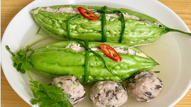 Món canh khổ qua với nước dùng đậm đà cùng nhân dai ngon từ thịt heo, khổ qua mềm thơm vị đắng vừa phải, ăn kèm cơm trắng thì ngon khó cưỡng.
