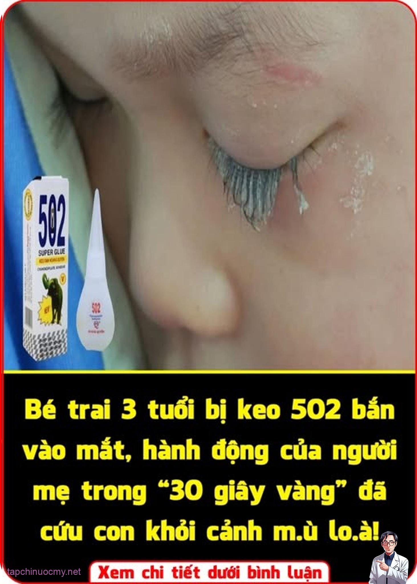 Trong một lần bố ở nhà trông Tiểu Minh cho mẹ cậu bé đi làm, anh đã nhanh trí cất hết tất cả đồ đạc nguy hại ra khỏi tầm mắt cậu bé để phòng trường hợp xấu xảy ra. Nhưng đúng là “người tính không bằng trời tính”, khi Tiểu Minh đang lục lọi đồ trong nhà, em bỗng thấy một lọ keo 502 cất sâu ở góc tủ. Vì tò mò, Tiểu Minh bèn mở nắp, keo trong lọ vô tình bắn vào mắt khiến cậu bé đau đớn khóc la.