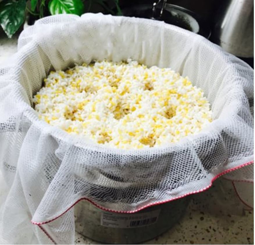 – Để tránh tình trạng xôi chín không đều, phía dưới nhão, trên sống, bạn lót khăn xô dưới chõ/xửng hấp rồi mới cho gạo vào. Phủ kín khăn lên mặt gạo để nước không bị đọng và chảy xuống gạo.
