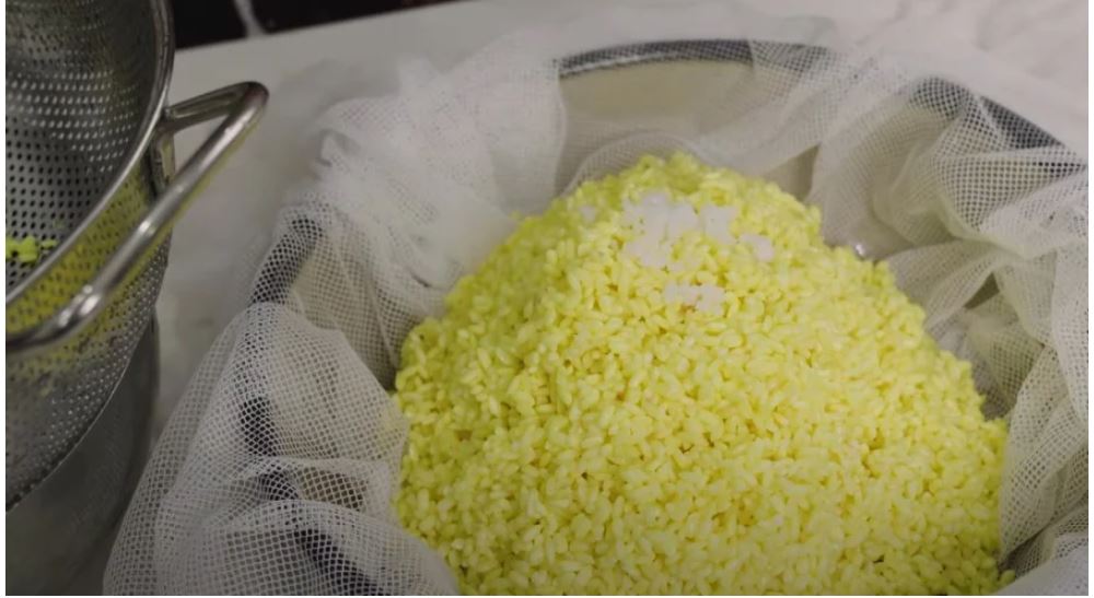 Đun sôi 1 lít nước rồi đổ gạo vào. Lấy muôi đảo liên tục gạo không dính vào đáy nồi vào bị cháy. Đảo khoảng 2-3 phút, khi thấy bên ngoài hạt gạo có một lớp áo trong mỏng bao quanh thì tắt bếp. Đổ gạo ra rá và xả bằng nước lạnh cho hết nhớt gạo.