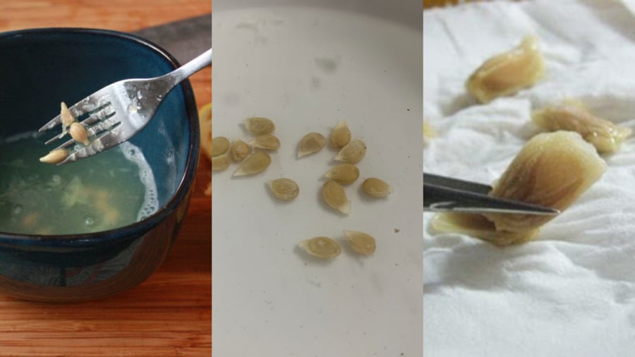 Sau khi ngâm bạn vớt hạt ra, để vào giấy và thấm cho khô nước. Bạn dùng dao loại bỏ lớp màng vỏ bên ngoài rồi cho vào nước ngâm tiếp vài giờ. Bạn dùng bình xịt tưới nhẹ lên bề mặt đất trong chậu trồng đã chuẩn bị trước đó để tạo độ ẩm cho đất sau đó lấy hạt ra trồng.
