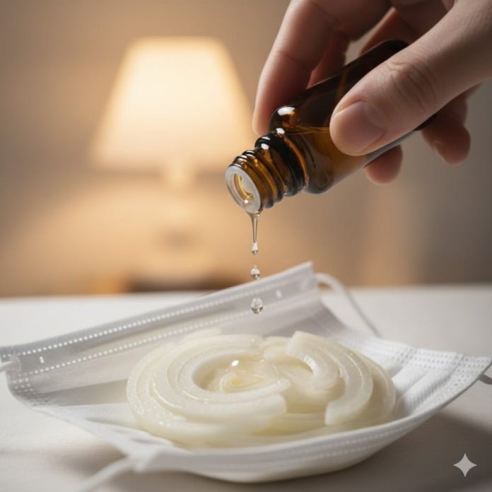 Hãy thử mẹo này: Bạn chỉ cần cắt nhỏ một củ hành tây, cho vào một chiếc khẩu trang y tế đã cắt hở một đầu, rồi nhỏ thêm vài giọt dầu gió. Sau đó, bạn buộc chặt túi lại và đặt nó ngay cạnh đầu giường.
