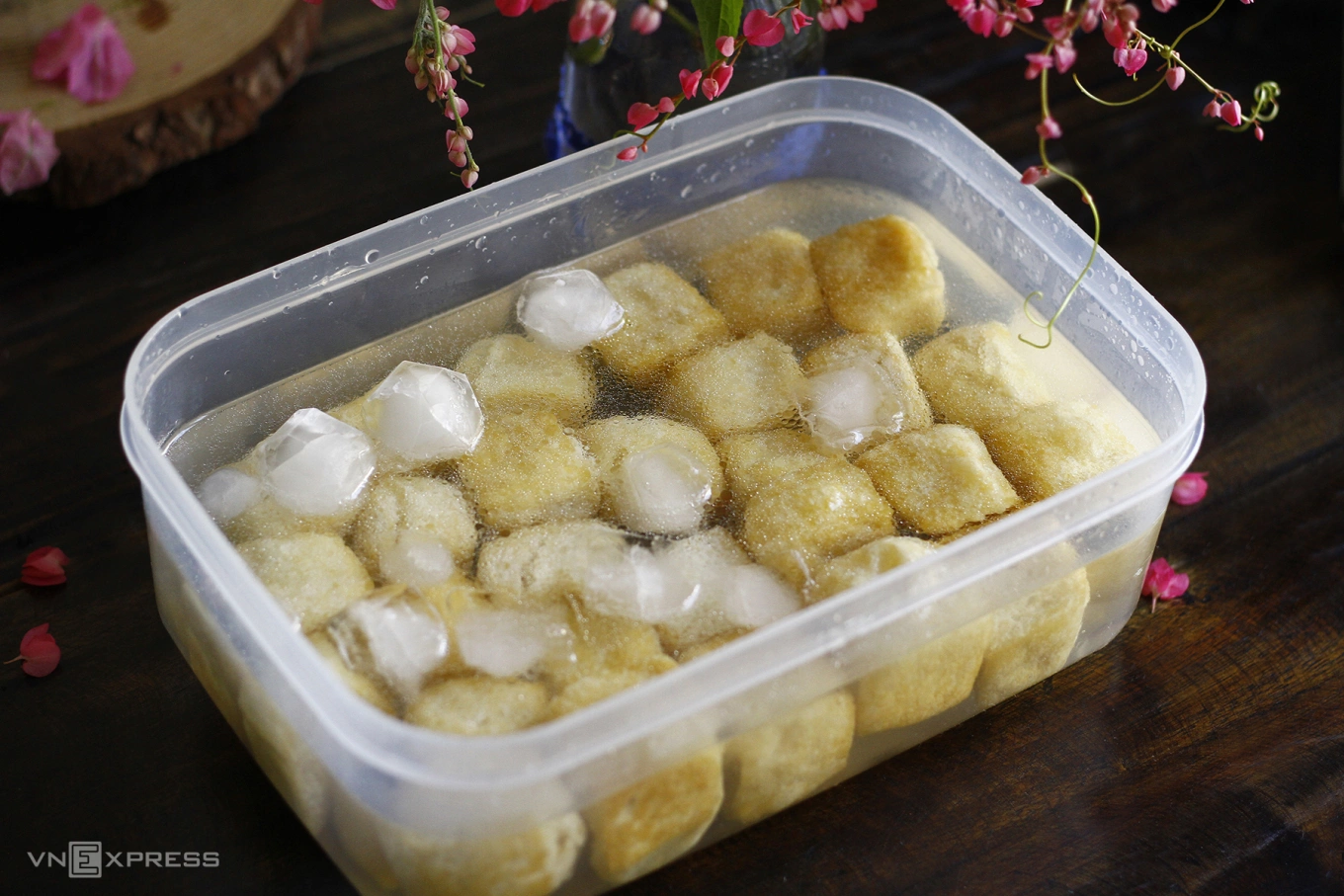Đậu phụ vừa rán xong cần vớt ra xả trực tiếp dưới vòi nước lạnh hoặc ngâm vào thau nước đá. Việc sốc nhiệt này giúp phần vỏ bên ngoài của miếng đậu se lại, độ ẩm được giữ lại bên trong. Làm theo cách này, phần ruột của miếng đậu sẽ mềm mọng, có vị ngọt tự nhiên.