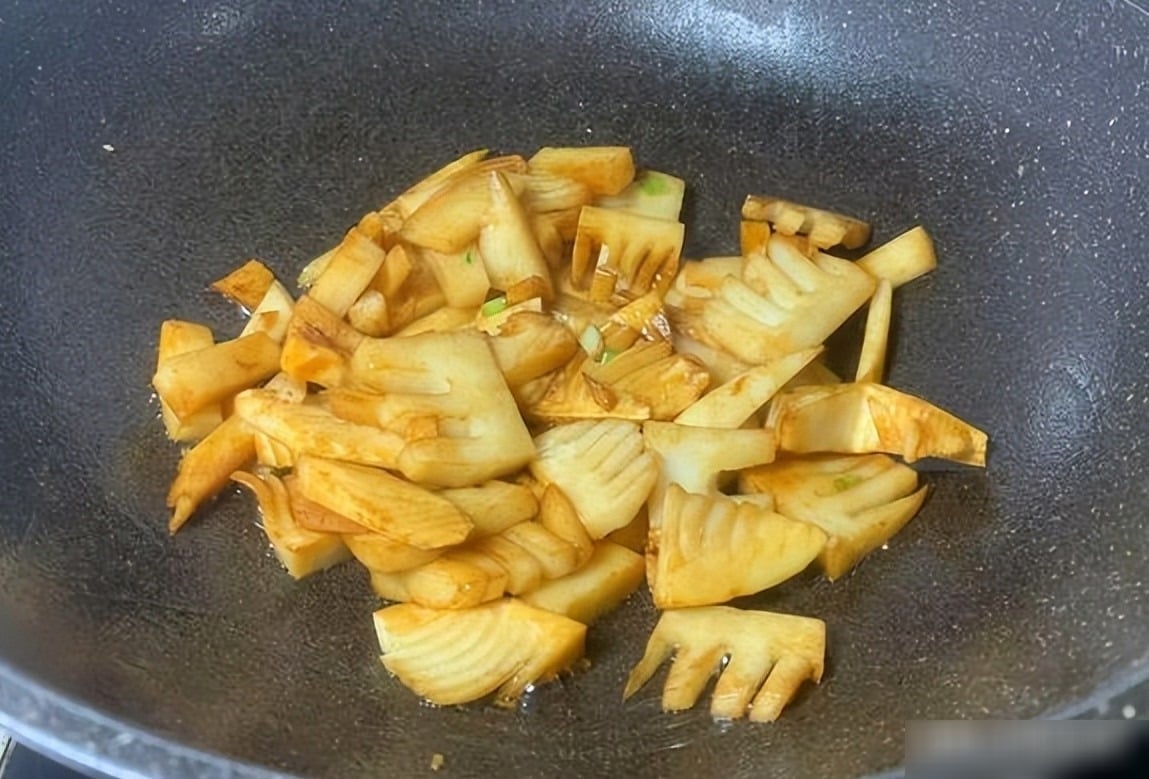 – Làm nóng dầu trong chảo. Khi dầu nóng, cho hành lá và gừng băm nhỏ vào xào thơm. Sau đó, cho măng đã chần vào đảo đều cho đến khi măng hơi vàng. Lúc này, cho chút nước mắm và nước tương nhạt vào, tiếp tục đảo cho đến khi mỗi miếng măng được phủ đều nước sốt.
