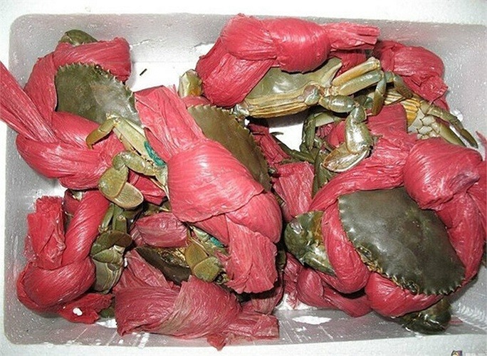 Những con cua được buộc dây khi bày bán là hình ảnh không hề hiếm gặp. Đây là cách để tránh cho cua bò ra ngoài, nhưng cũng có người bán vô lương tâm sẵn sàng trục lợi thông qua các sợi dây này. Thực tế, đã có không ít trường hợp khách hàng ngớ người sau khi mở sợi dây ra khỏi con cua. Có những sợi dây dài hàng mét được quấn chặt thành nhiều lớp nên khi mua không ai phát hiện được, chỉ khi về mở ra mới tá hỏa.