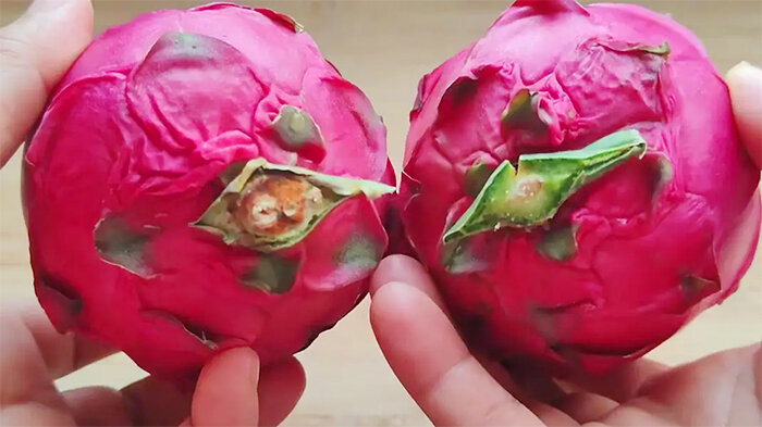 Cuống quả: Các vết cắt ở cuống phản ánh khoảng thời gian thanh long được thu hoạch. Nếu khu vực này khô và có màu đen hoặc vàng chứng tỏ nó được thu hoạch từ lâu, mất đi độ ẩm, giảm hương vị. Nên họn những quả thanh long có cuống tươi và màu sắc bình thường.