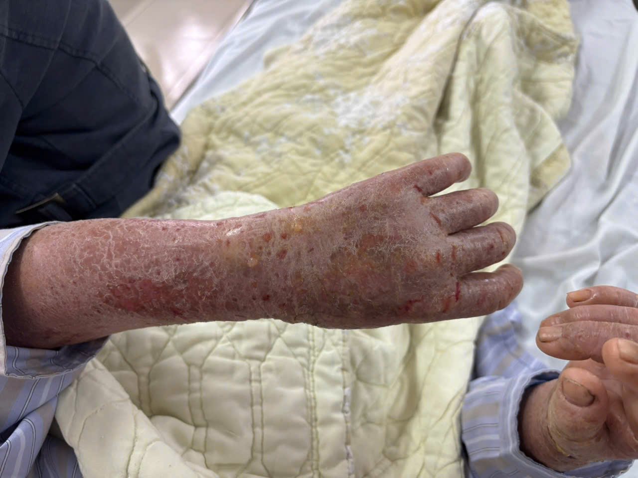 Khi nhập viện, bệnh nhân được ghi nhận trong tình trạng toàn thân nề đỏ, nứt nẻ, bong vảy, sốt và ngứa nhiều.