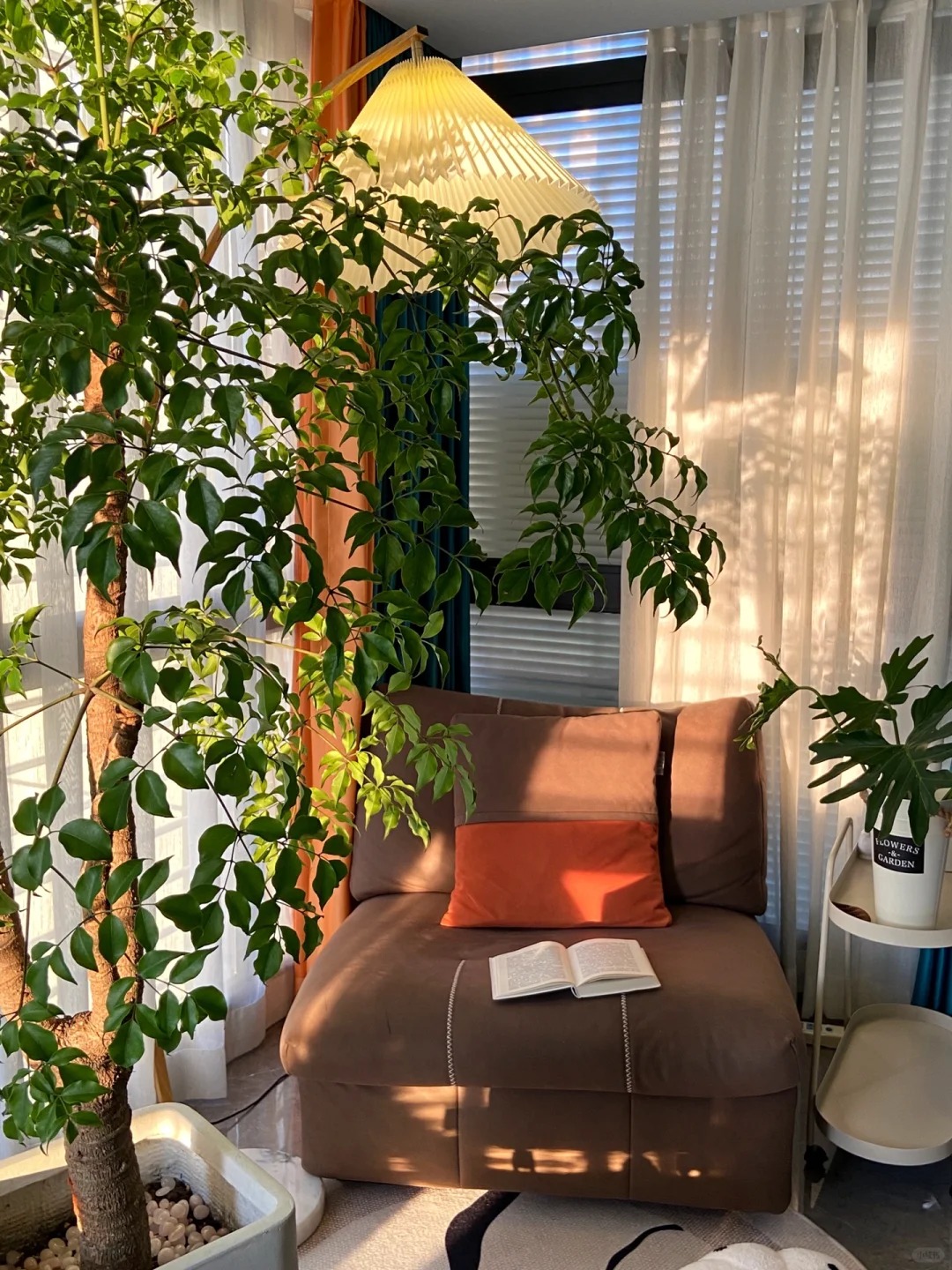 Cây cảnh mảnh mai, vươn cao, lá xanh tươi, sáng bóng vươn mình một cách ấn tượng ở góc phòng khách.