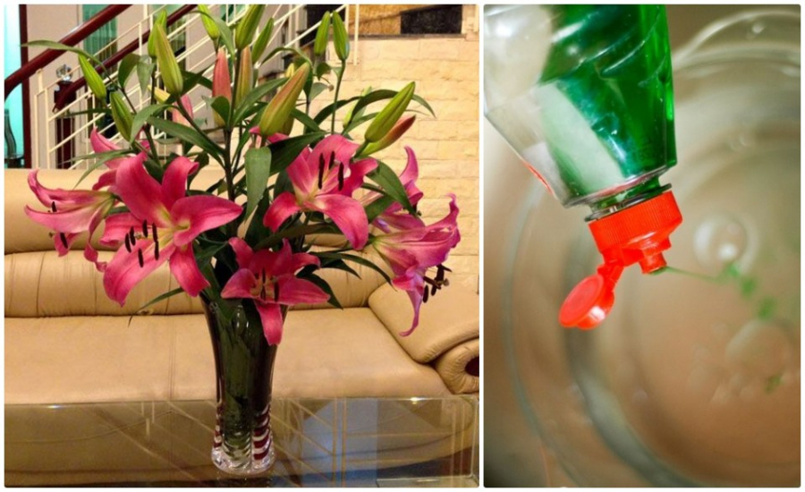 Bạn có thể cho vào bình nước cắm hoa một ít nước rửa chén sẽ giúp hoa tươi lâu và không bị thối.