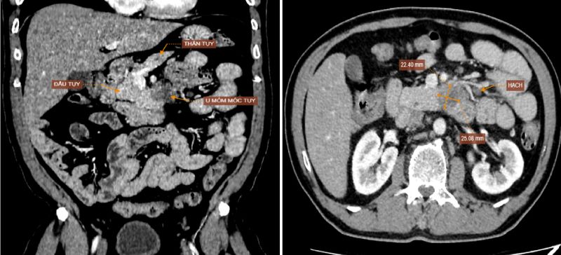Kết quả nội soi không ghi nhận bất thường, tuy nhiên hình ảnh CT cho thấy khối u vùng mỏm móc đầu tụy có dấu hiệu xâm lấn động mạch mạc treo tràng trên và tá tràng. Đồng thời phát hiện thêm tổn thương đa ổ ở gan, hạch ổ bụng và nốt đặc ở thùy dưới phổi phải – nghi ngờ di căn xa. Kết quả sinh thiết sau đó xác nhận bệnh nhân mắc u:ng th:ư biểu mô tuyến tụy giai đoạn T4N2M1 (giai đoạn cuối). Bệnh nhân được chuyển sang cơ sở chuyên khoa ung bướu để tiếp tục điều trị.
