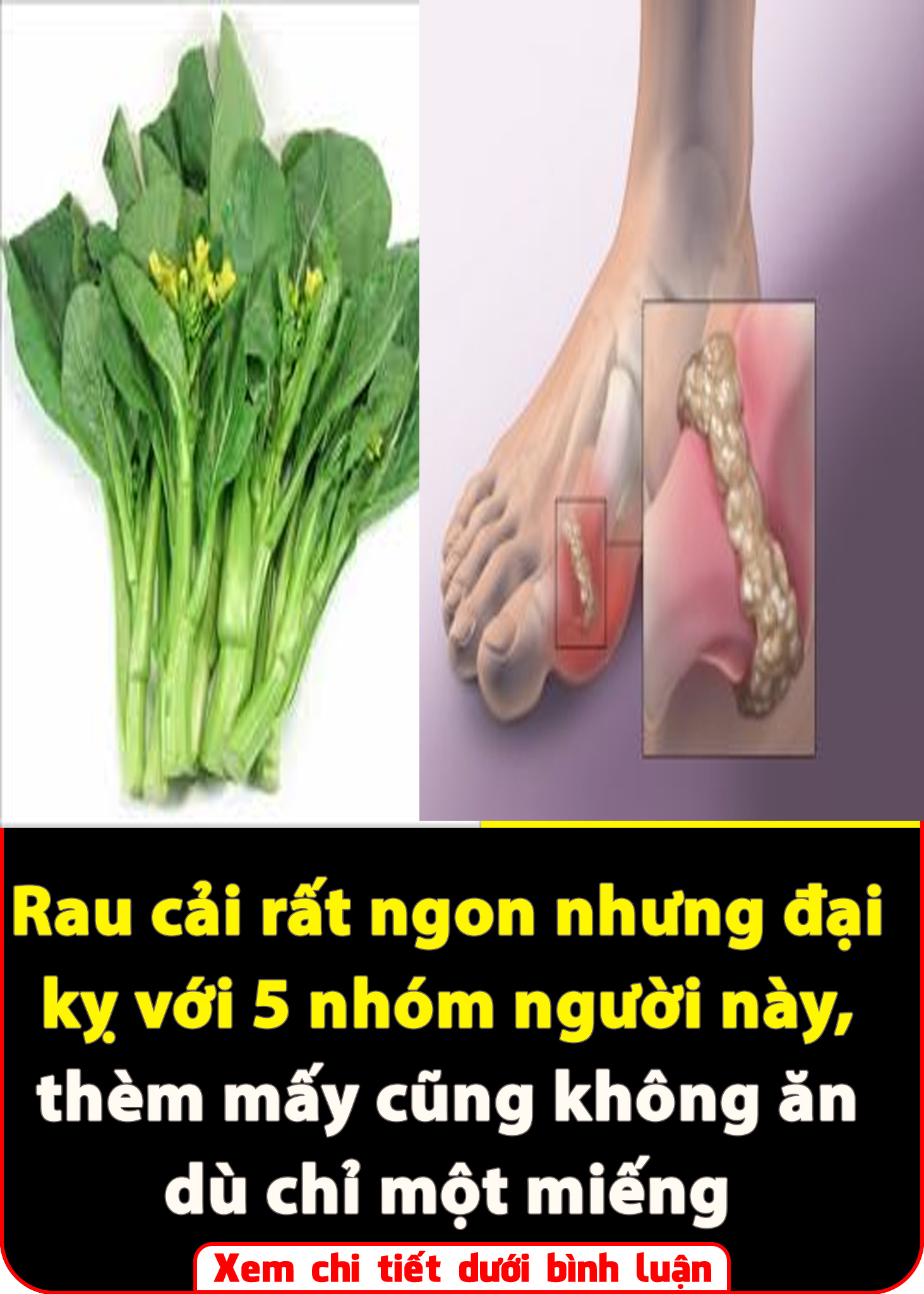 Các loại rau cải có hàm lượng purin ở nhóm B, 50 – 150mg/100g. Trong khi đó, các thực phẩm có hàm lượng purin cao có thể dẫn đến nguy cơ mắc bệnh gút. Vì vậy nếu bạn thuộc nhóm người có nguy cơ mắc bệnh gút cao, bạn nên hỏi ý kiến bác sĩ về liều lượng sử dụng loại rau này.