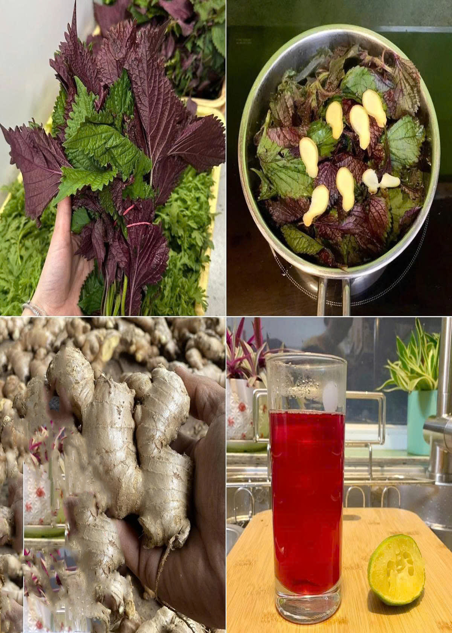 Lá tía tô ngâm với nước muối pha loãng rồi rửa sạch. Đun sôi 2,5 lít nước lọc rồi cho lá tía tô vào. Đậy kín nắp, để hỗn hợp sôi khoảng 2 phút thì tắt bếp, để nguội. Sau đó, cho 3 lát chanh tươi vào bình, đậy nắp, bảo quản trong ngăn mát tủ lạnh để uống suốt cả ngày.