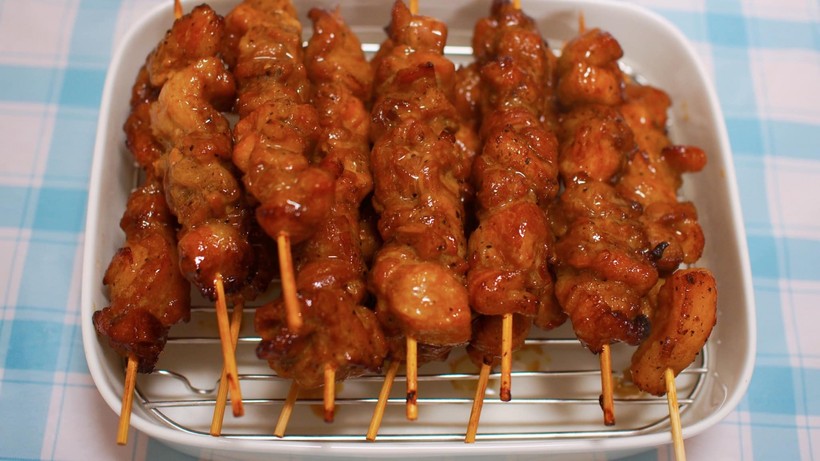Nướng thịt: Bạn có thể nướng thịt bằng lò nướng, nồi chiên không dầu, nhưng ngon nhất là bằng than hoa. Phết nhẹ lớp dầu ăn lên vỉ nướng, xếp lần lượt xiên thịt lên dàn đều ra. Nếu dùng lò nướng thì cho thêm nước vào khay đen (hoặc lót giấy bạc), bật trước lò 10 phút ở 180- 200 độ, sau đó cho vỉ nướng xếp thịt xiên vào. Sau 10 phút, lấy thịt ra, quết hỗn hợp nước sốt ở trên. Lặp lại lần nữa, trở (lật) xiên thịt, quết rồi nướng cho tới khi thịt chín vàng, hơi sém là được. Tổng thời gian khoảng 35 – 40 phút. Với nồi chiên không dầu, bạn cũng căn chỉnh nhiệt độ và thời gian như trên.