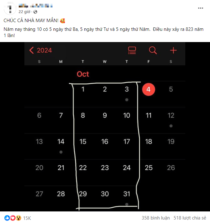 Cụ thể, không ít cư dân mạng share hình ảnh về sự kỳ lạ rằng tháng 10 năm nay có 5 ngày thứ Ba, 5 ngày thứ Tư, 5 ngày thứ Năm. Đây là dấu hiệu của may mắn và tiền bạc.