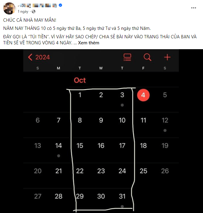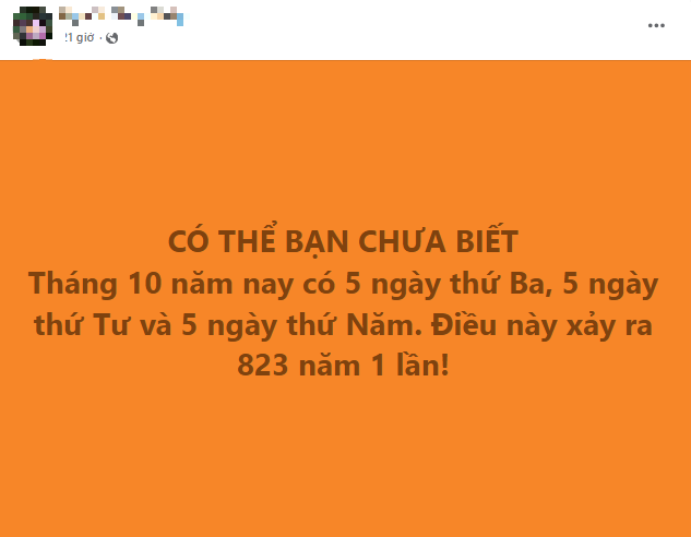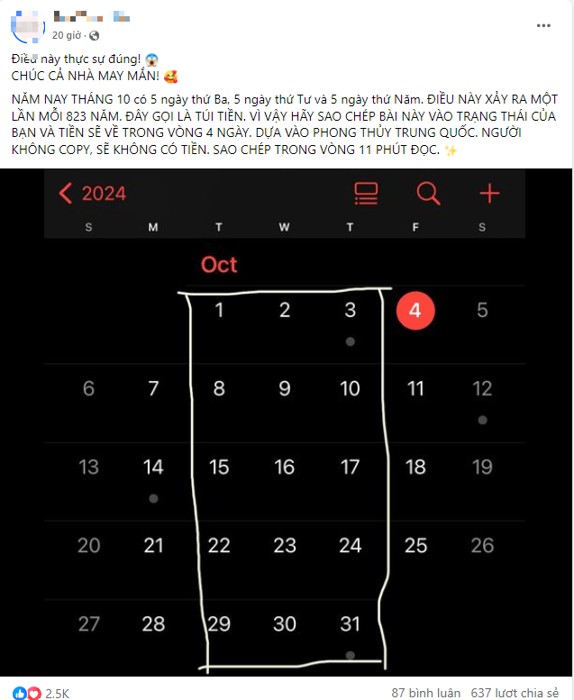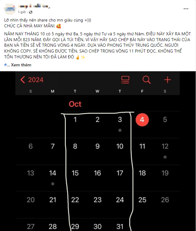 “Năm nay tháng 10 có 5 ngày thứ Ba, 5 ngày thứ Tư và 5 ngày thứ Năm. Điều này xảy ra một lần mỗi 823 năm. Theo phong thủy Trung Quốc, đây gọi là túi tiền. Vì vậy, hãy sao chép bài này vào trạng thái của bạn và tiền sẽ về trong vòng 4 ngày. Người không copy, sẽ không có tiền, sao chép trong vòng 11 phút đọc”.